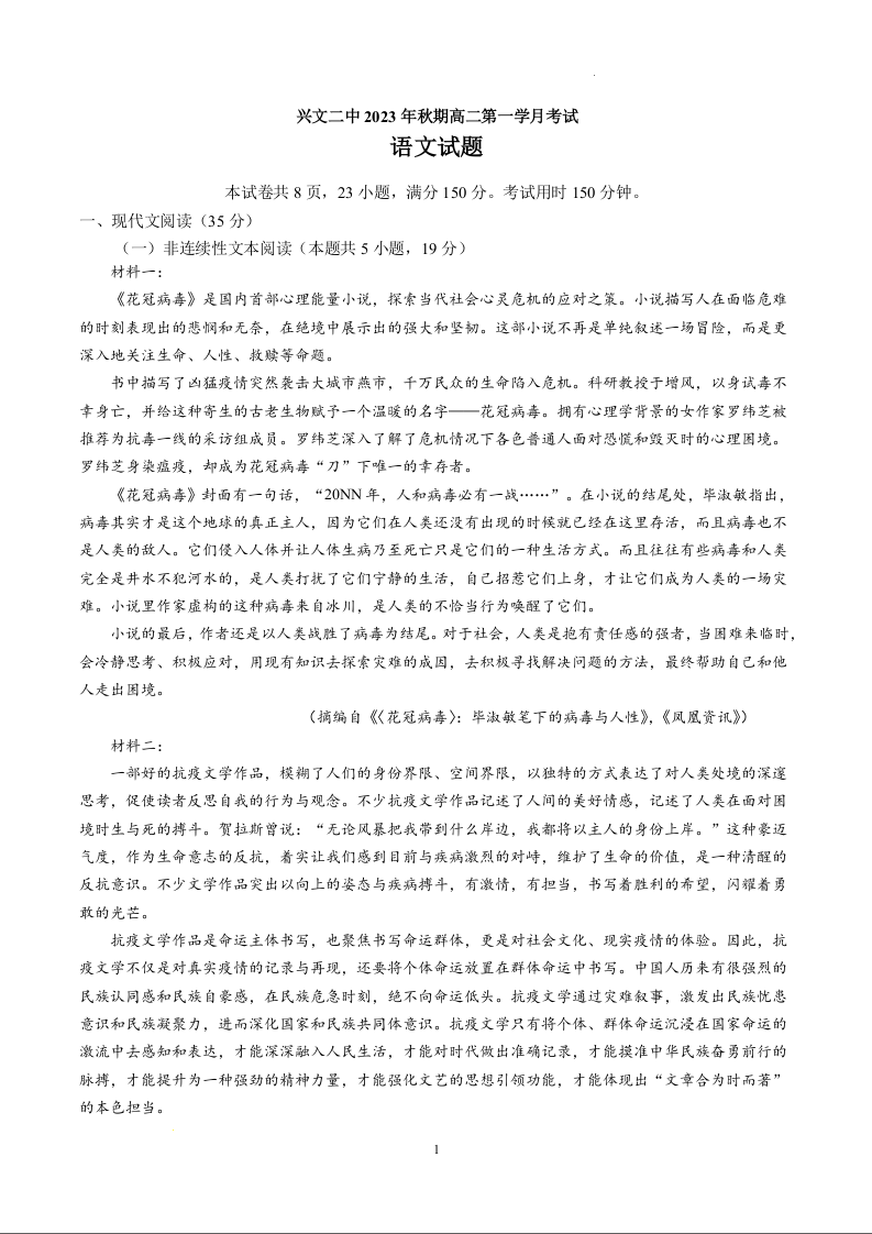 四川省宜宾市兴文第二中学校2023-2024学年高二上学期10月月考语文