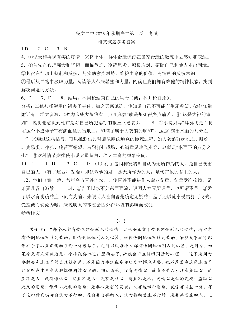 四川省宜宾市兴文第二中学校2023-2024学年高二上学期10月月考语文答案