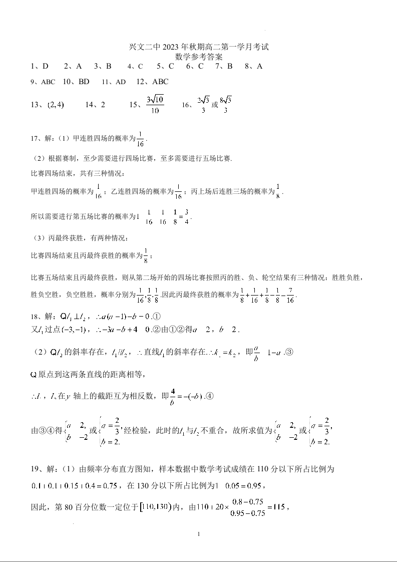 四川省宜宾市兴文第二中学校2023-2024学年高二上学期10月月考数学答案