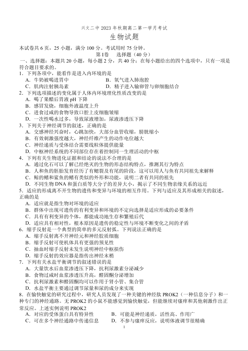 四川省宜宾市兴文第二中学校2023-2024学年高二上学期10月月考生物