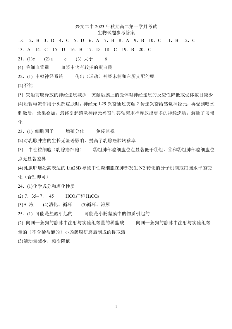 四川省宜宾市兴文第二中学校2023-2024学年高二上学期10月月考生物答案