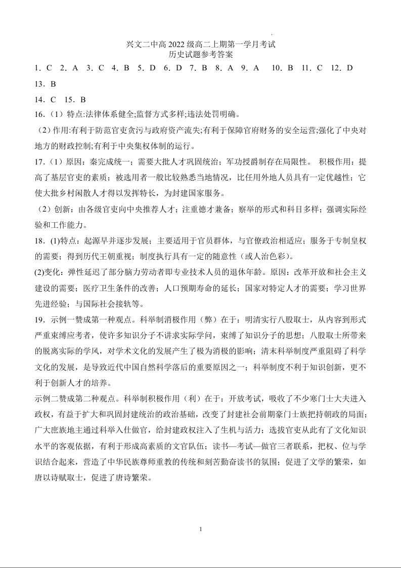 四川省宜宾市兴文第二中学校2023-2024学年高二上学期10月月考历史答案