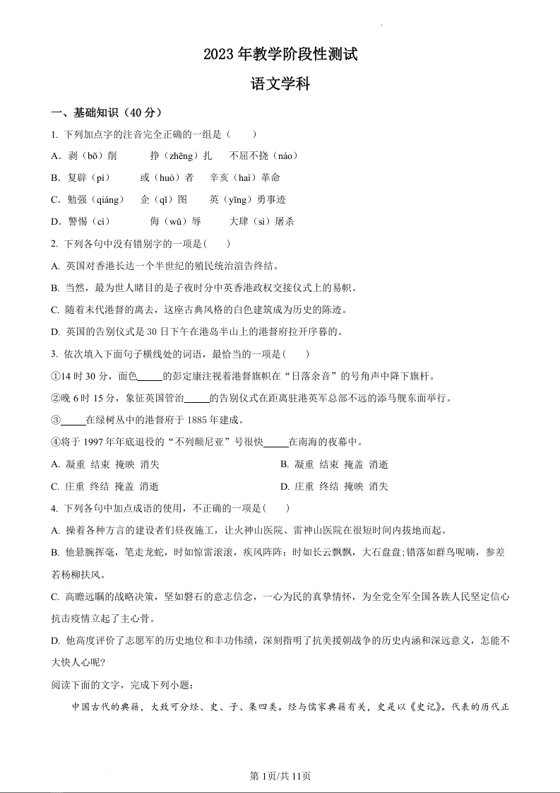 天津市静海区北师大实验学校2023-2024学年高二上学期第一阶段评估试题语文
