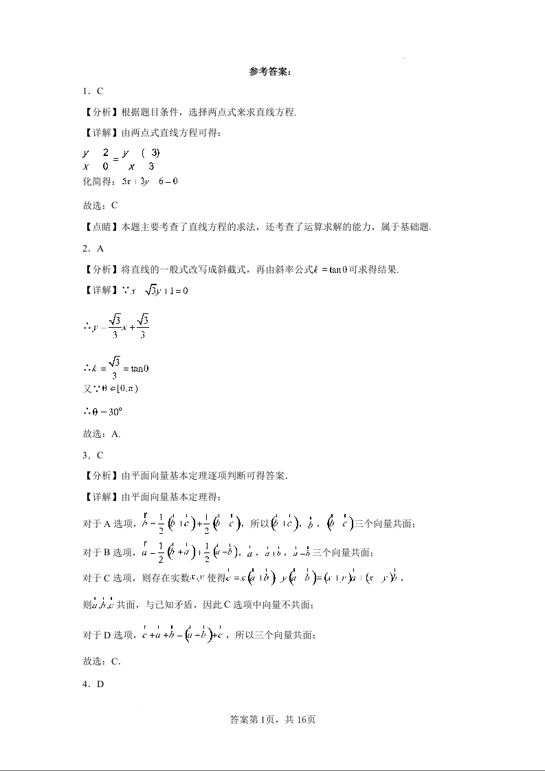 天津市静海区北师大实验学校2023-2024学年高二上学期第一阶段评估试题数学答案