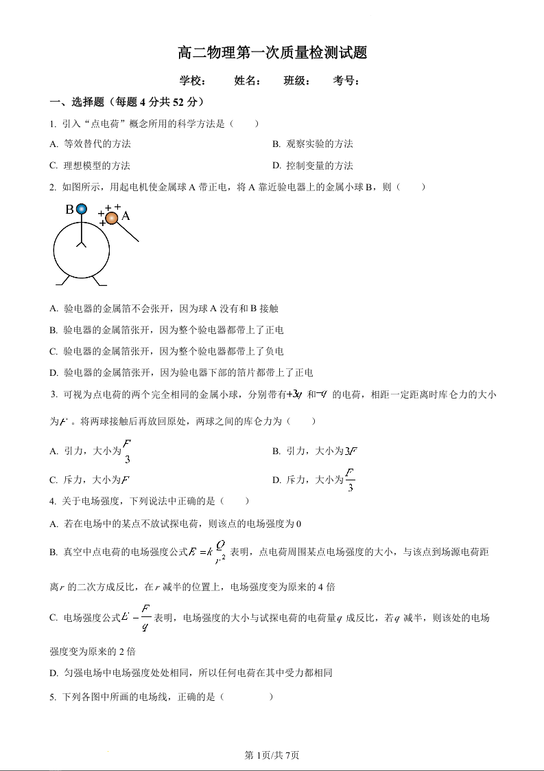 天津市静海区北师大实验学校2023-2024学年高二上学期第一阶段评估试题物理(原卷版)