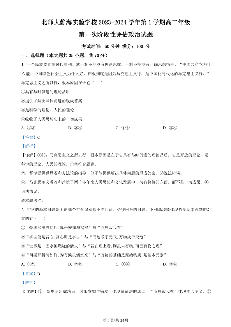 天津市静海区北师大实验学校2023-2024学年高二上学期第一阶段评估试题政治(精品解析版)
