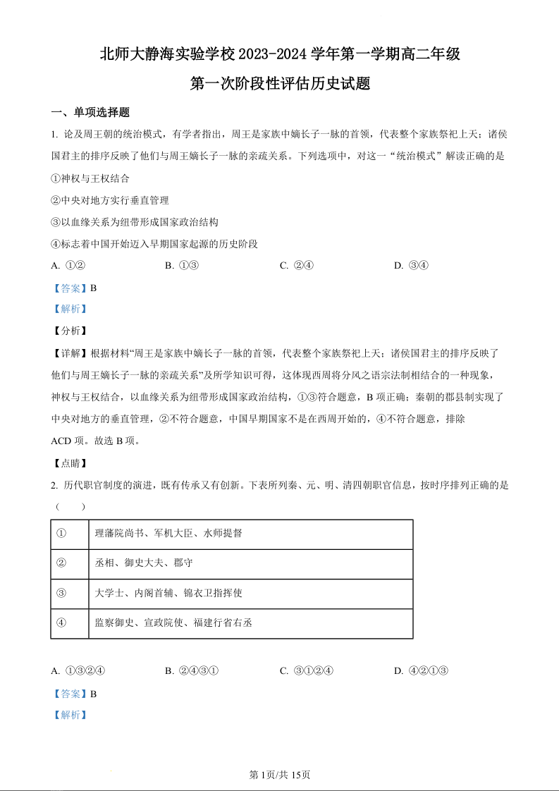 天津市静海区北师大实验学校2023-2024学年高二上学期第一阶段评估试题历史(精品解析版)