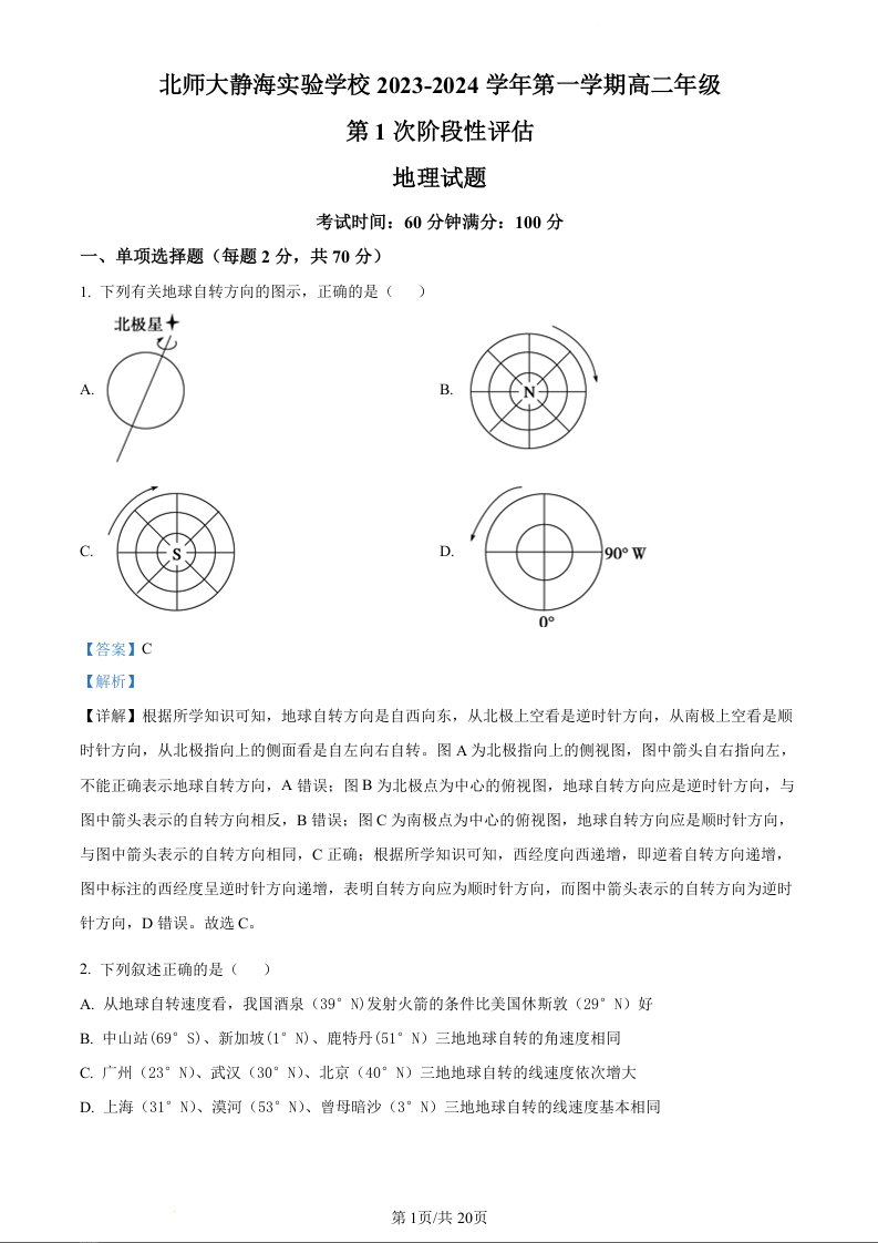 天津市静海区北师大实验学校2023-2024学年高二上学期第一阶段评估试题地理(精品解析版)