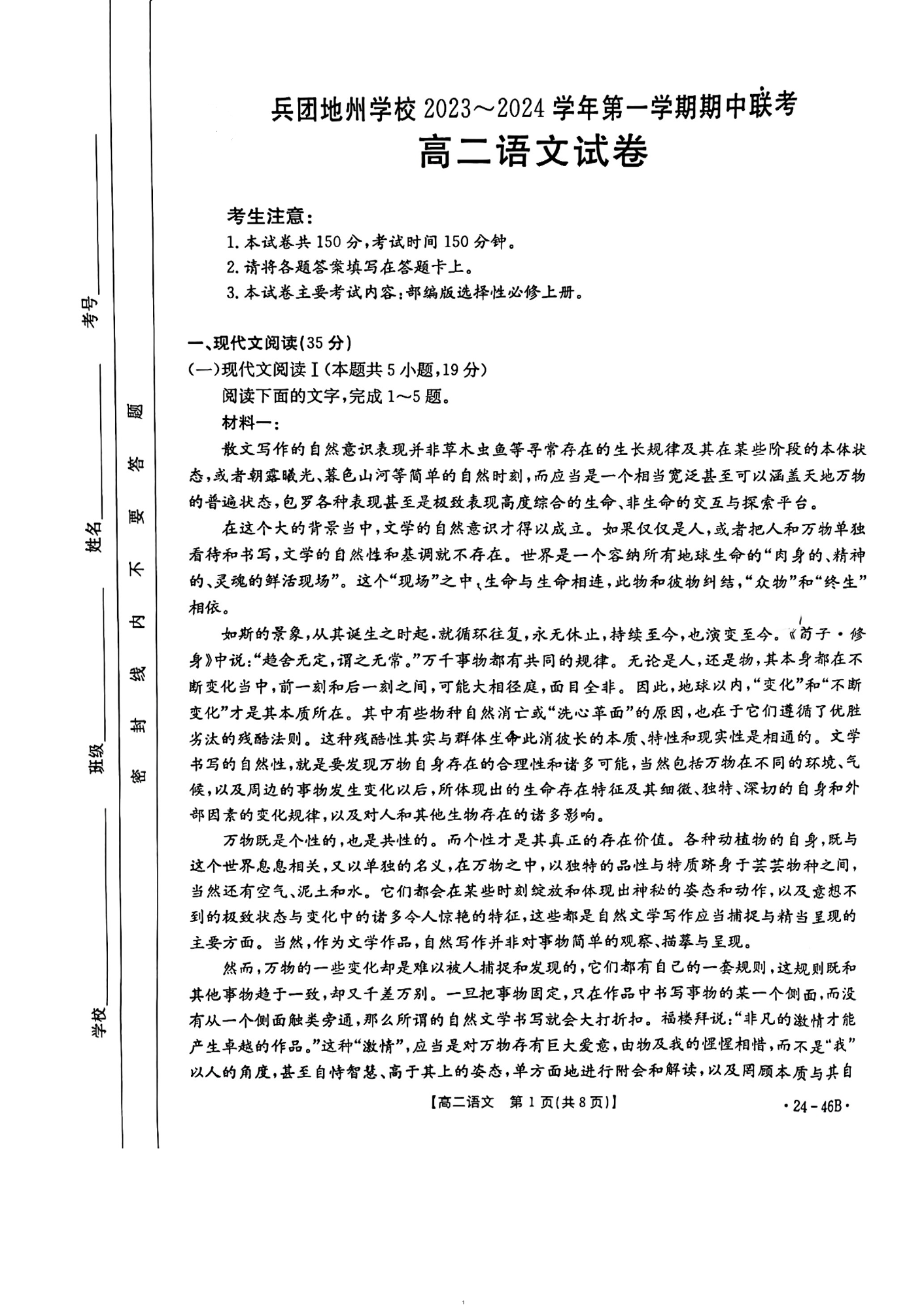 新疆兵团地州学校2023-2024学年高二上学期期中联考 语文