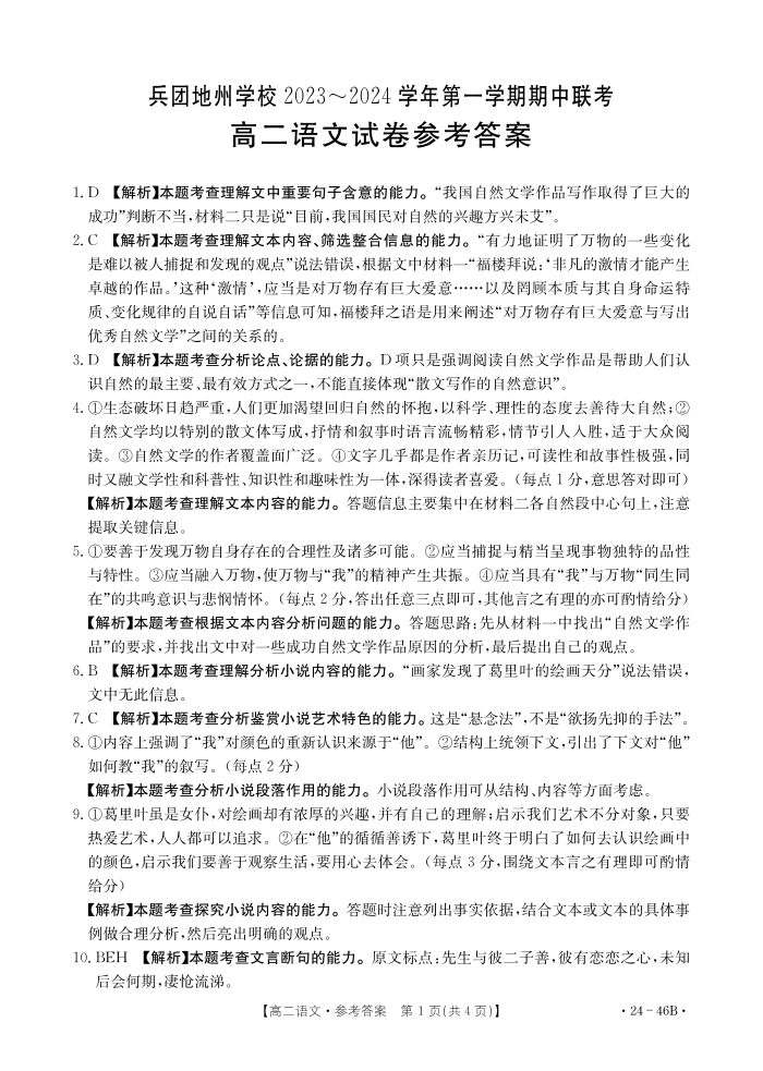 新疆兵团地州学校2023-2024学年高二上学期期中联考 语文答案