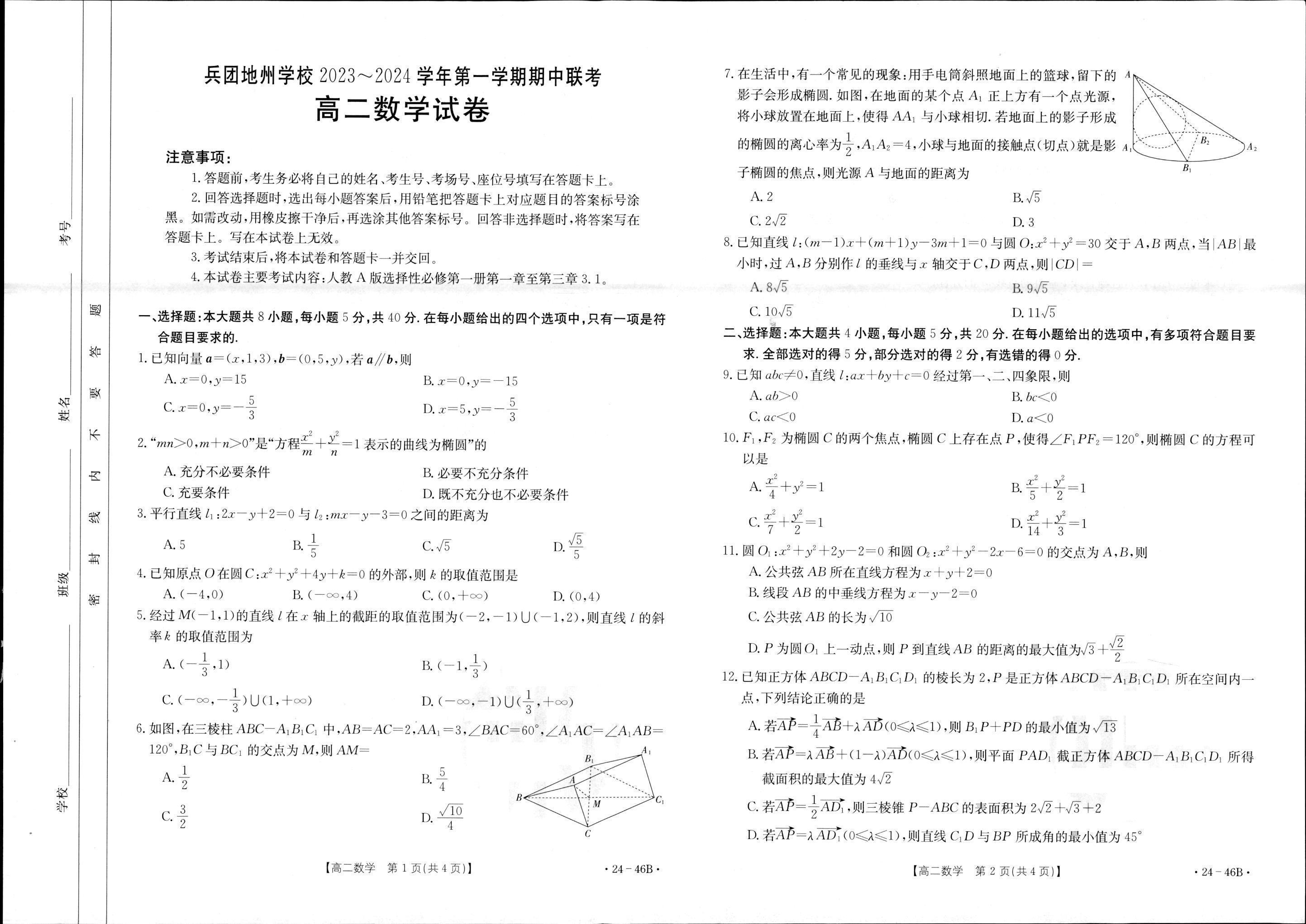 新疆兵团地州学校2023-2024学年高二上学期期中联考 数学