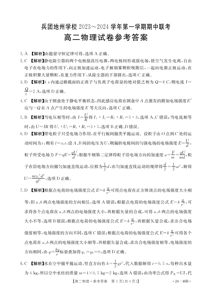 新疆兵团地州学校2023-2024学年高二上学期期中联考 物理答案