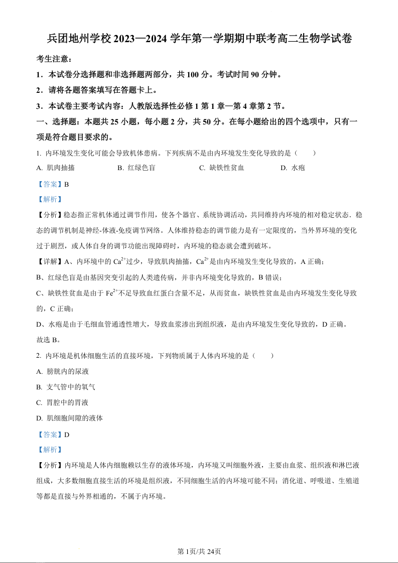 新疆兵团地州学校2023-2024学年高二上学期期中联考生物(精品解析版)