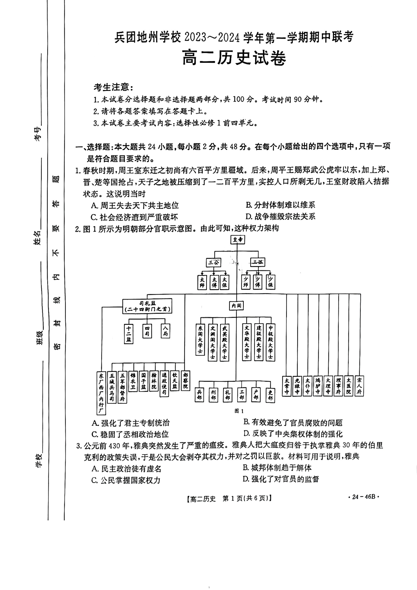 新疆兵团地州学校2023-2024学年高二上学期期中联考 历史