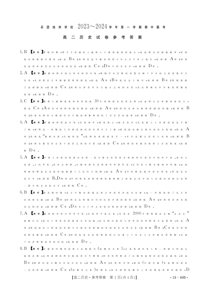 新疆兵团地州学校2023-2024学年高二上学期期中联考 历史答案
