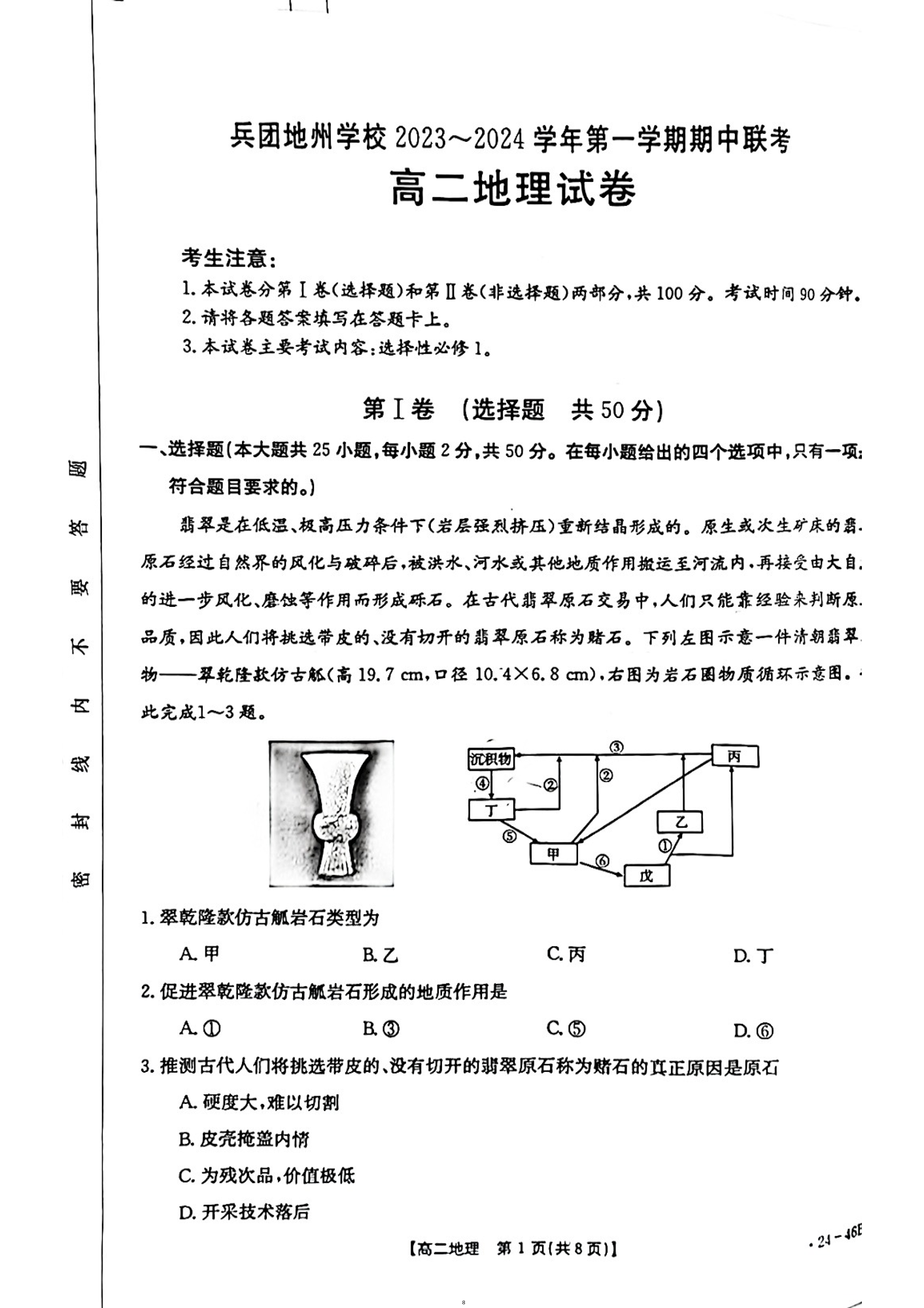 新疆兵团地州学校2023-2024学年高二上学期期中联考地理