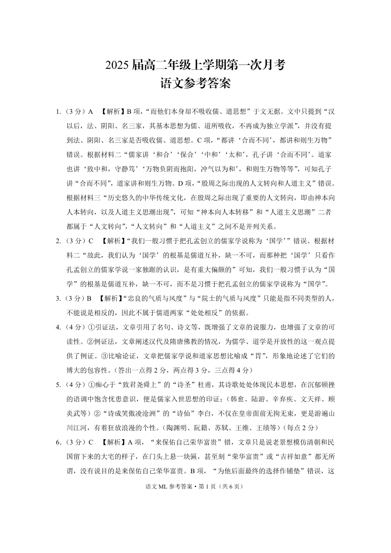 云南师范大学附属中学2023-2024学年高二上学期10月月考 语文答案