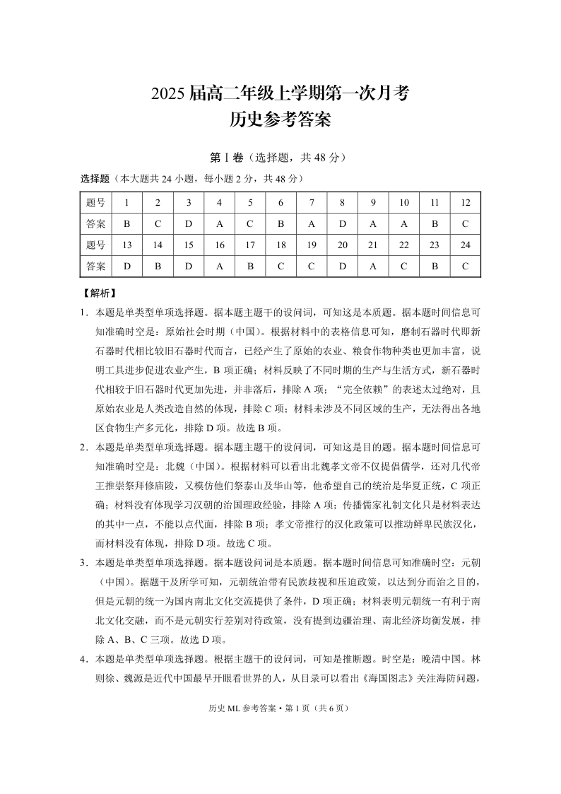 云南师范大学附属中学2023-2024学年高二上学期10月月考 历史答案