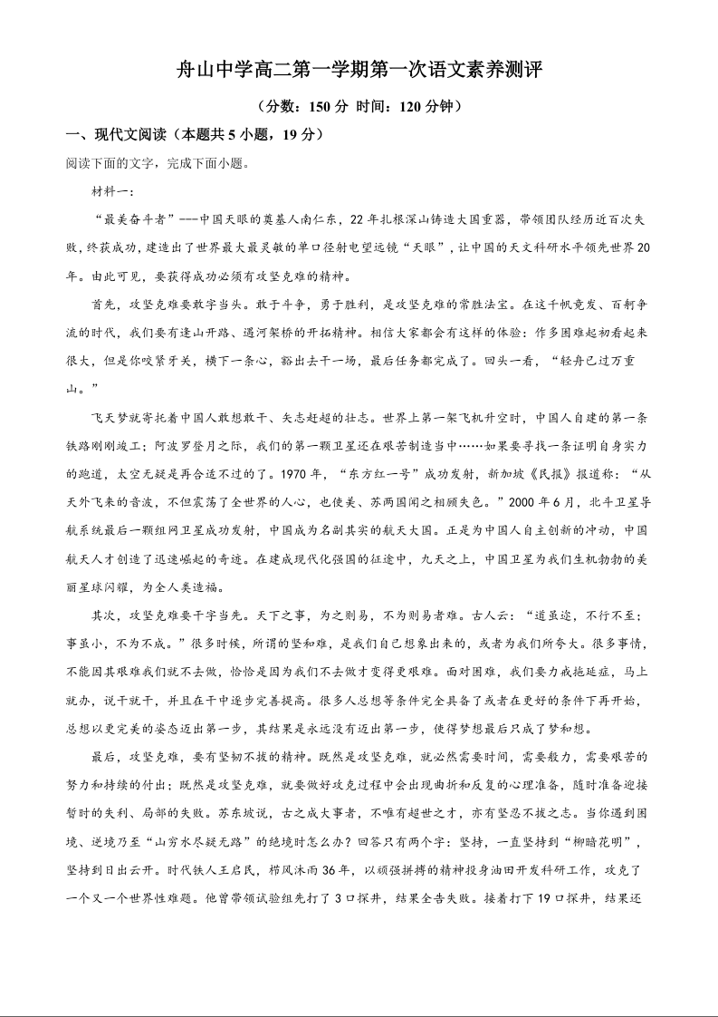 浙江省舟山中学2023-2024学年高二上学期10月月考试题 语文+答案
