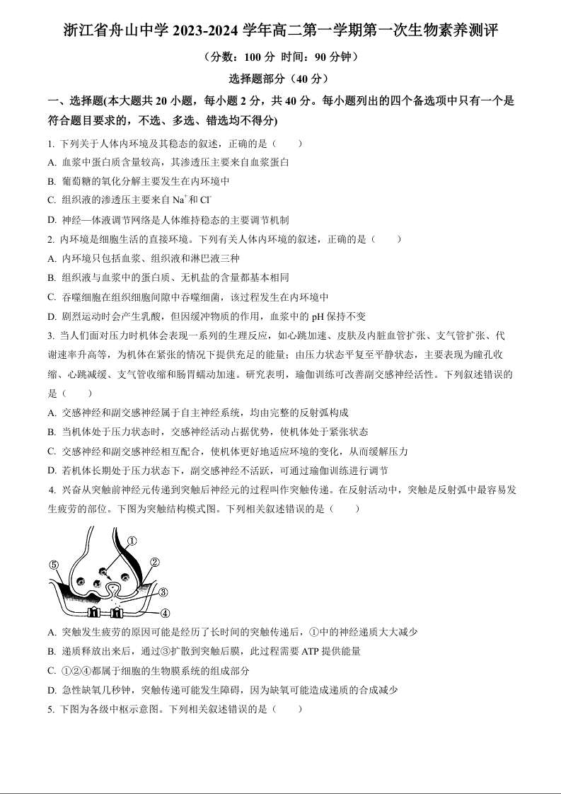 浙江省舟山中学2023-2024学年高二上学期10月月考试题 生物+答案