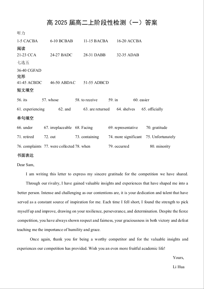 重庆市西南大学附中2023-2024学年高二上学期10月阶段性检测 英语答案