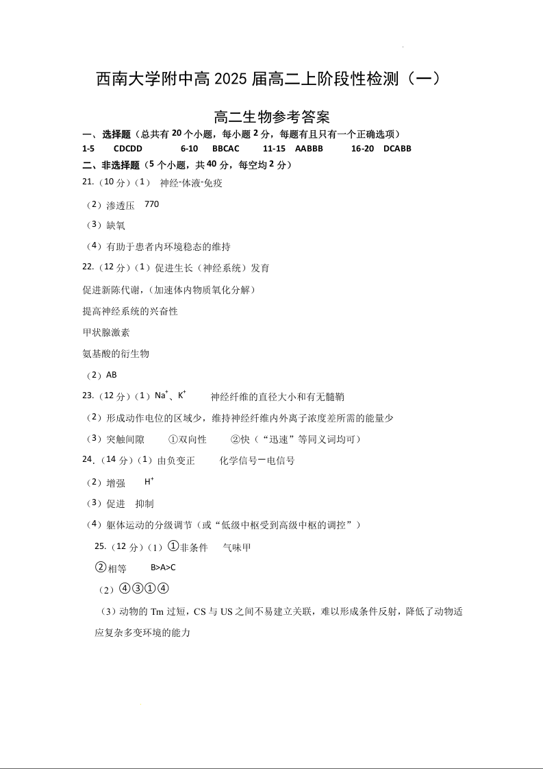 重庆市西南大学附中2023-2024学年高二上学期10月阶段性检测 生物答案