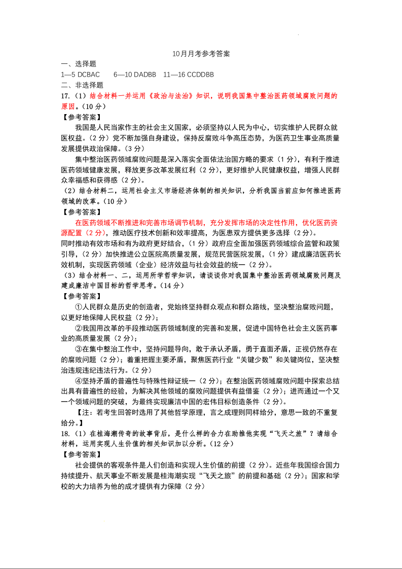 重庆市西南大学附中2023-2024学年高二上学期10月阶段性检测 政治答案