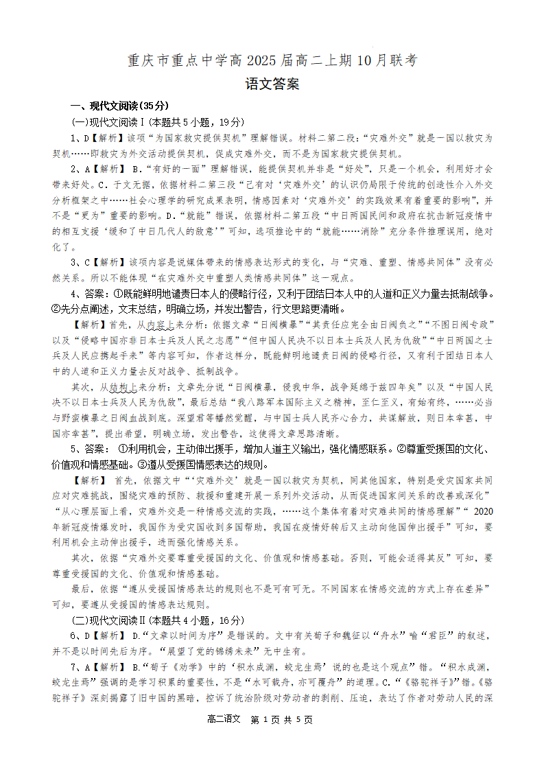 重庆市重点中学2023-2024学年高二10月联考语文答案