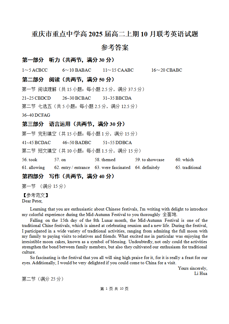 重庆市重点中学2023-2024学年高二10月联考英语答案
