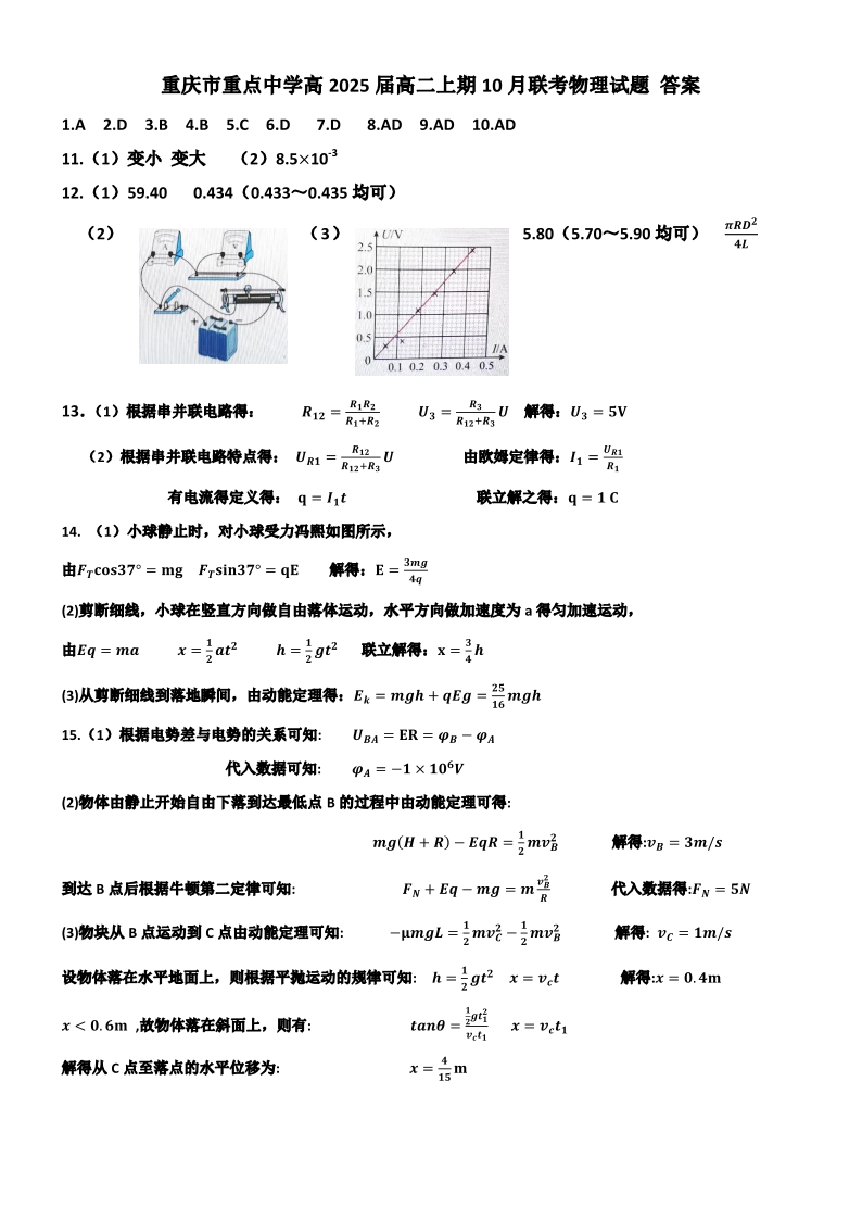 重庆市重点中学2023-2024学年高二10月联考物理答案