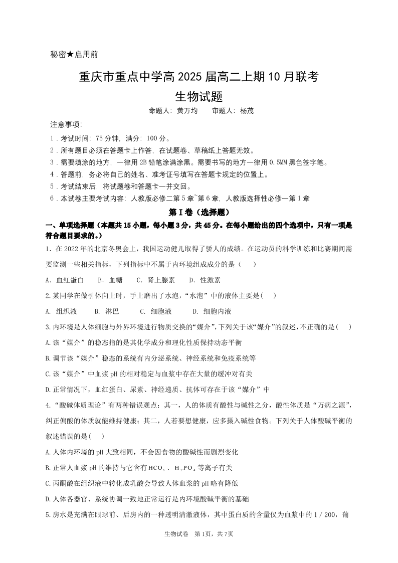 重庆市重点中学2023-2024学年高二10月联考生物