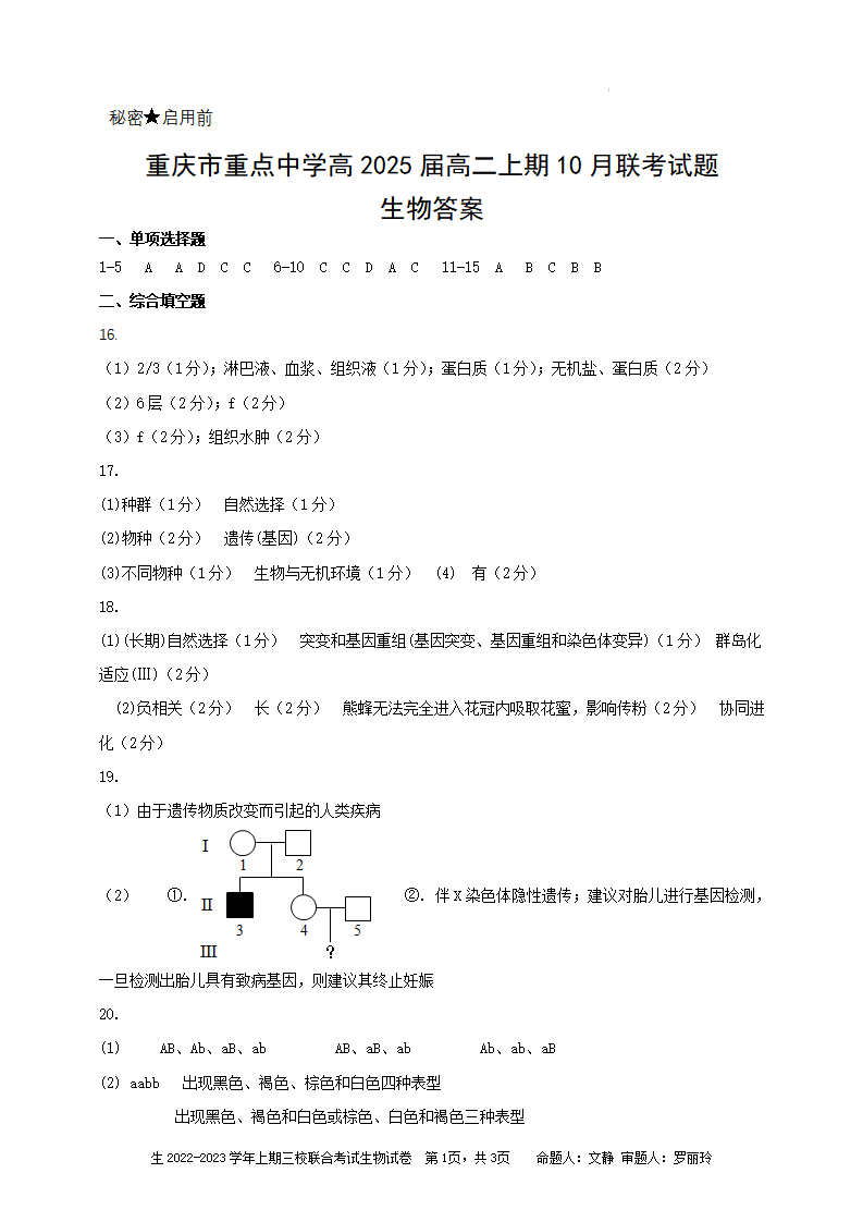 重庆市重点中学2023-2024学年高二10月联考生物答案