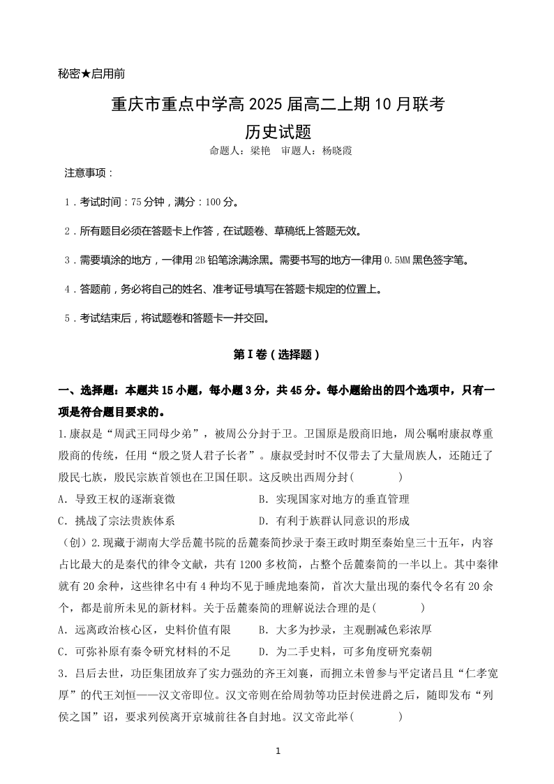 重庆市重点中学2023-2024学年高二10月联考历史