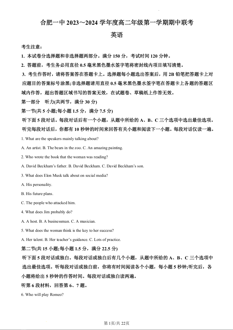 安徽省合肥市第一中学等校2023-2024学年高二上学期期中联考试题英语(精品解析版)