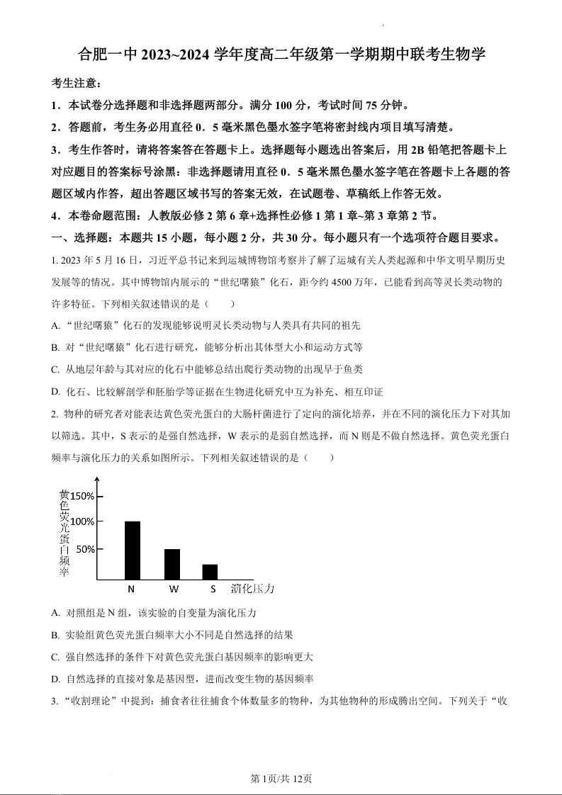安徽省合肥市第一中学等校2023-2024学年高二上学期期中联考试题生物(原卷版)