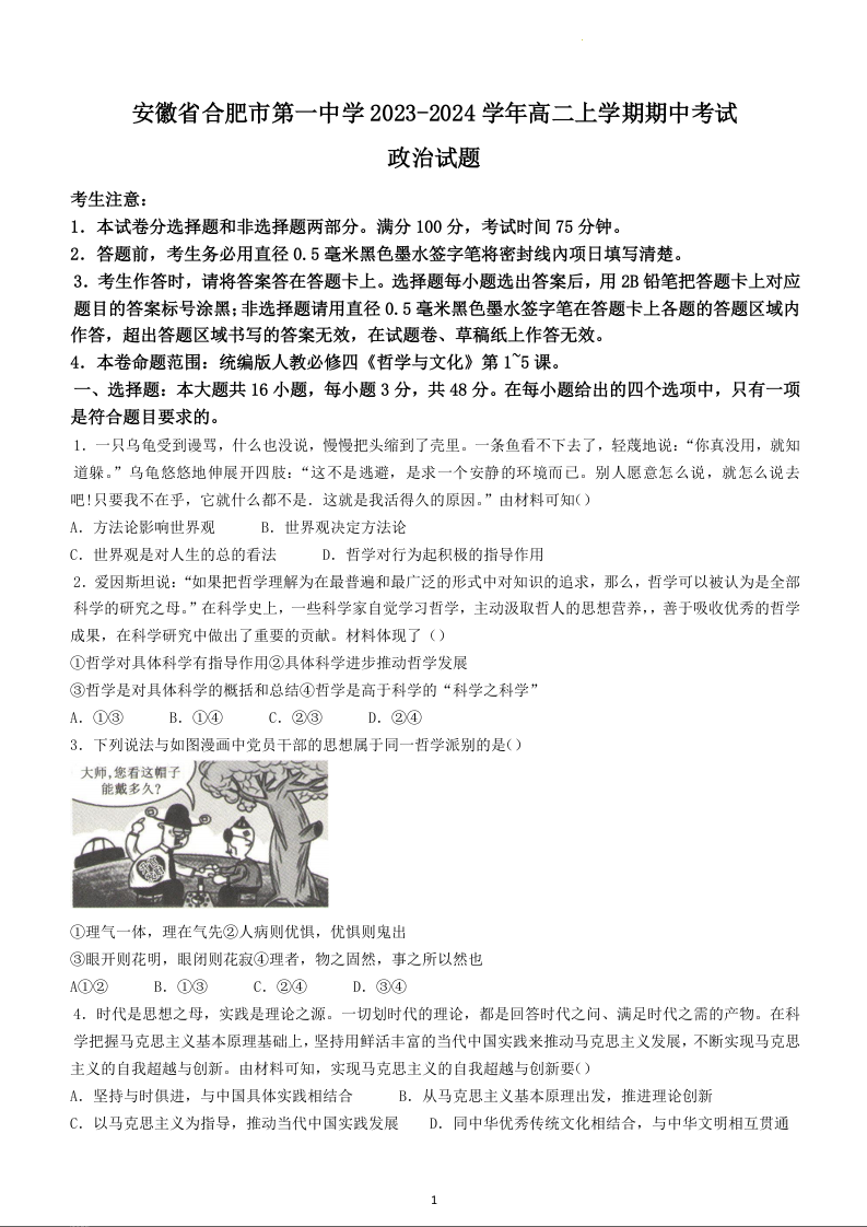 安徽省合肥市第一中学等校2023-2024学年高二上学期期中联考试题政治+答案