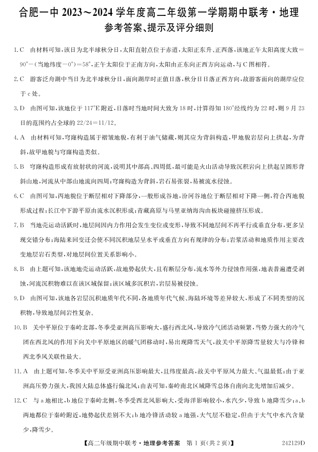 安徽省合肥市第一中学等校2023-2024学年高二上学期期中联考试题地理答案