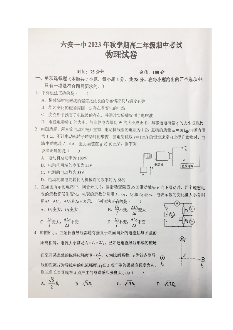 安徽省六安第一中学2023-2024学年高二上学期期中考试试题物理+答案