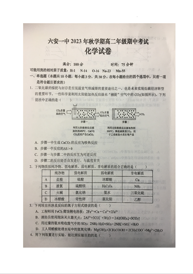 安徽省六安第一中学2023-2024学年高二上学期期中考试试题化学+答案