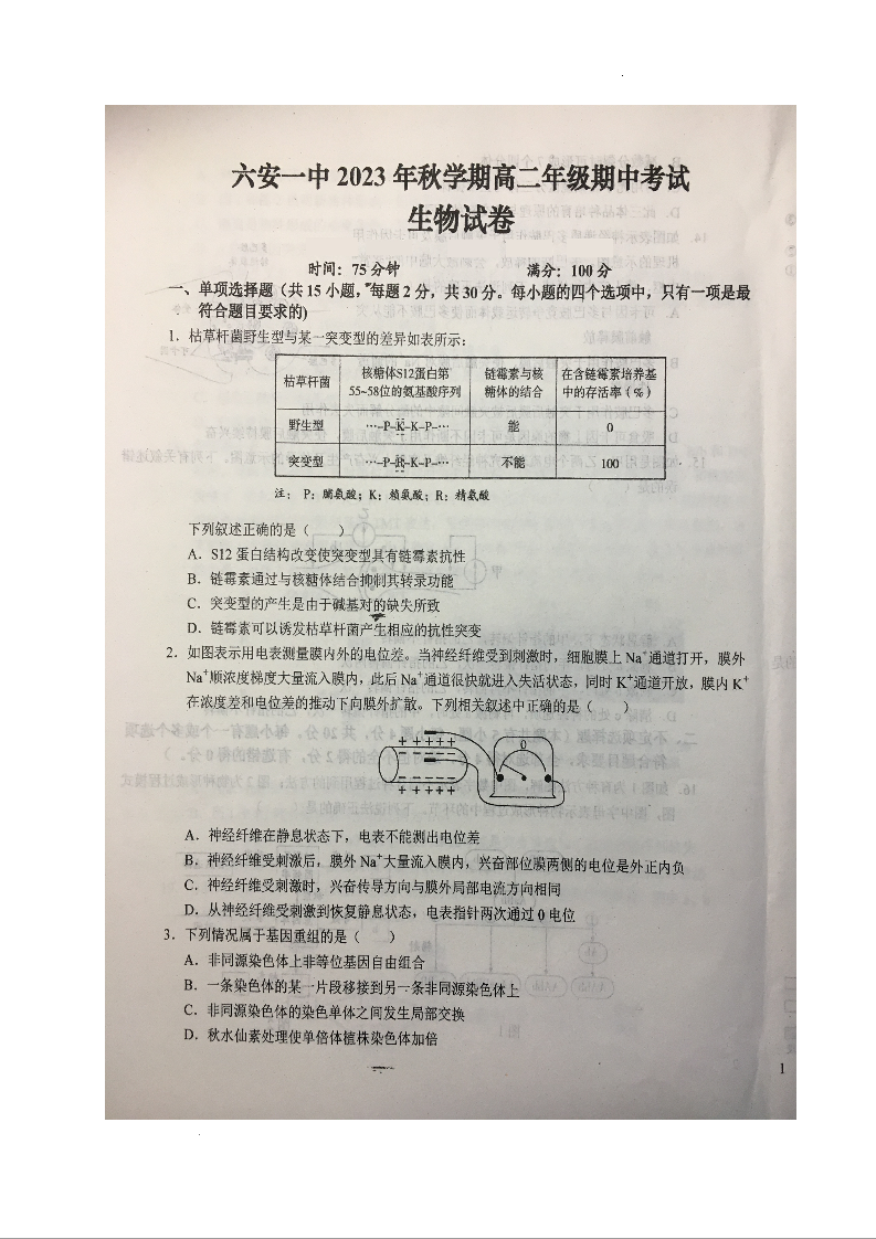 安徽省六安第一中学2023-2024学年高二上学期期中考试试题生物+答案