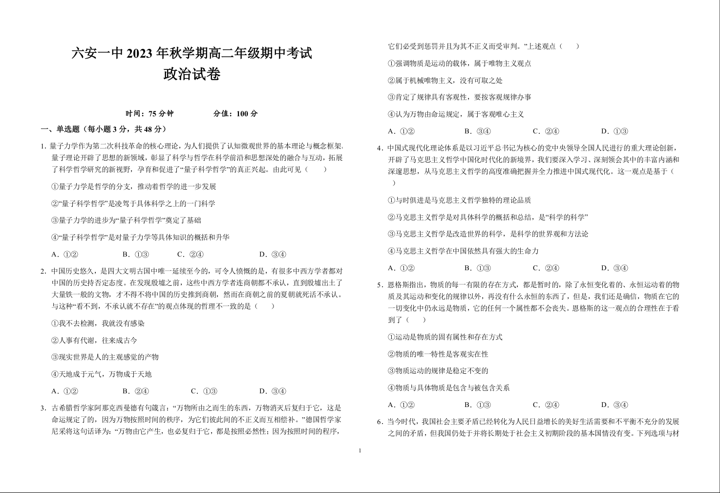 安徽省六安第一中学2023-2024学年高二上学期期中考试试题政治+答案
