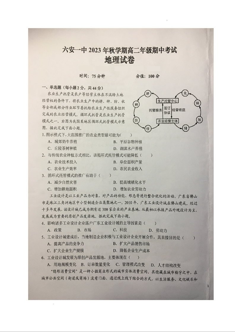 安徽省六安第一中学2023-2024学年高二上学期期中考试试题地理+答案