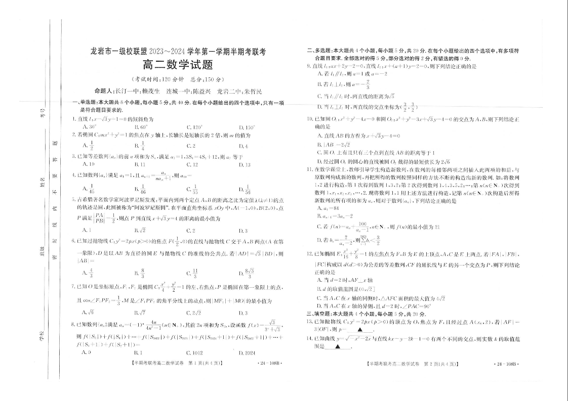 福建省龙岩市龙岩市一级校联盟2023-2024学年高二上学期11月期中试题数学