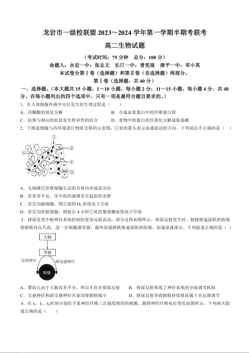 福建省龙岩市龙岩市一级校联盟2023-2024学年高二上学期11月期中试题生物+答案