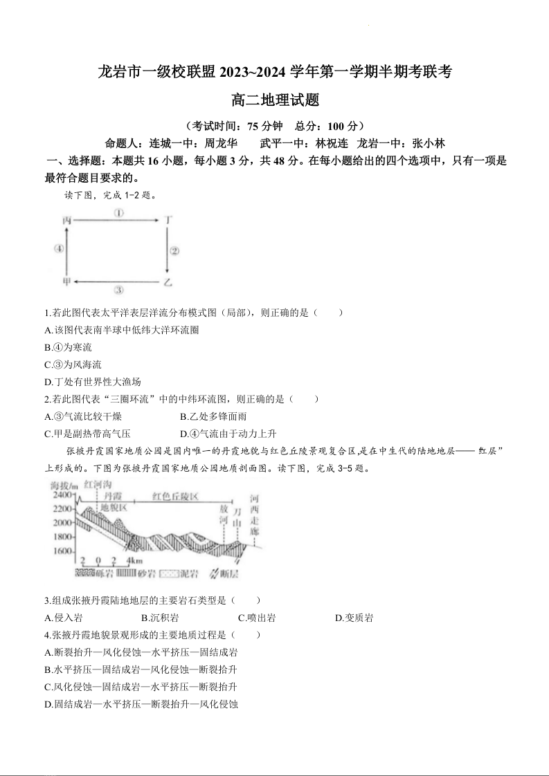 福建省龙岩市龙岩市一级校联盟2023-2024学年高二上学期11月期中试题地理+答案