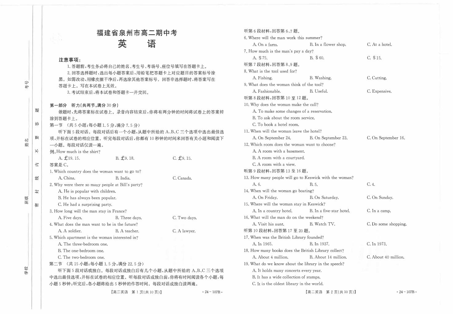 福建省泉州市安溪县2023-2024学年高二上学期11月期中试题英语