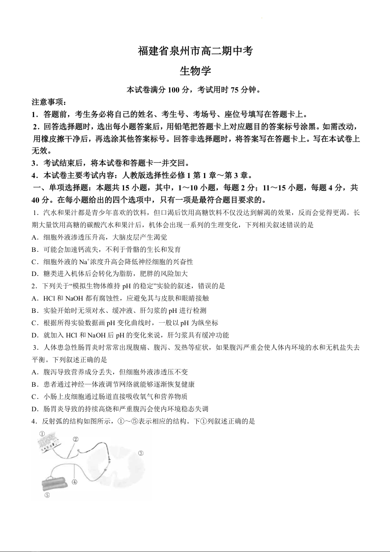 福建省泉州市安溪县2023-2024学年高二上学期11月期中试题生物
