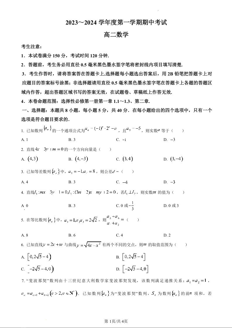 甘肃省酒泉市四校2023-2024学年高二上学期期中联考试题数学(原卷版)