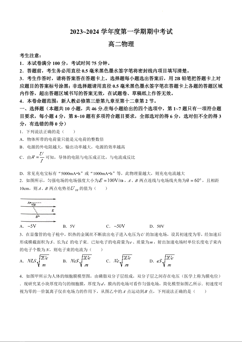 甘肃省酒泉市四校2023-2024学年高二上学期期中联考试题物理+答案