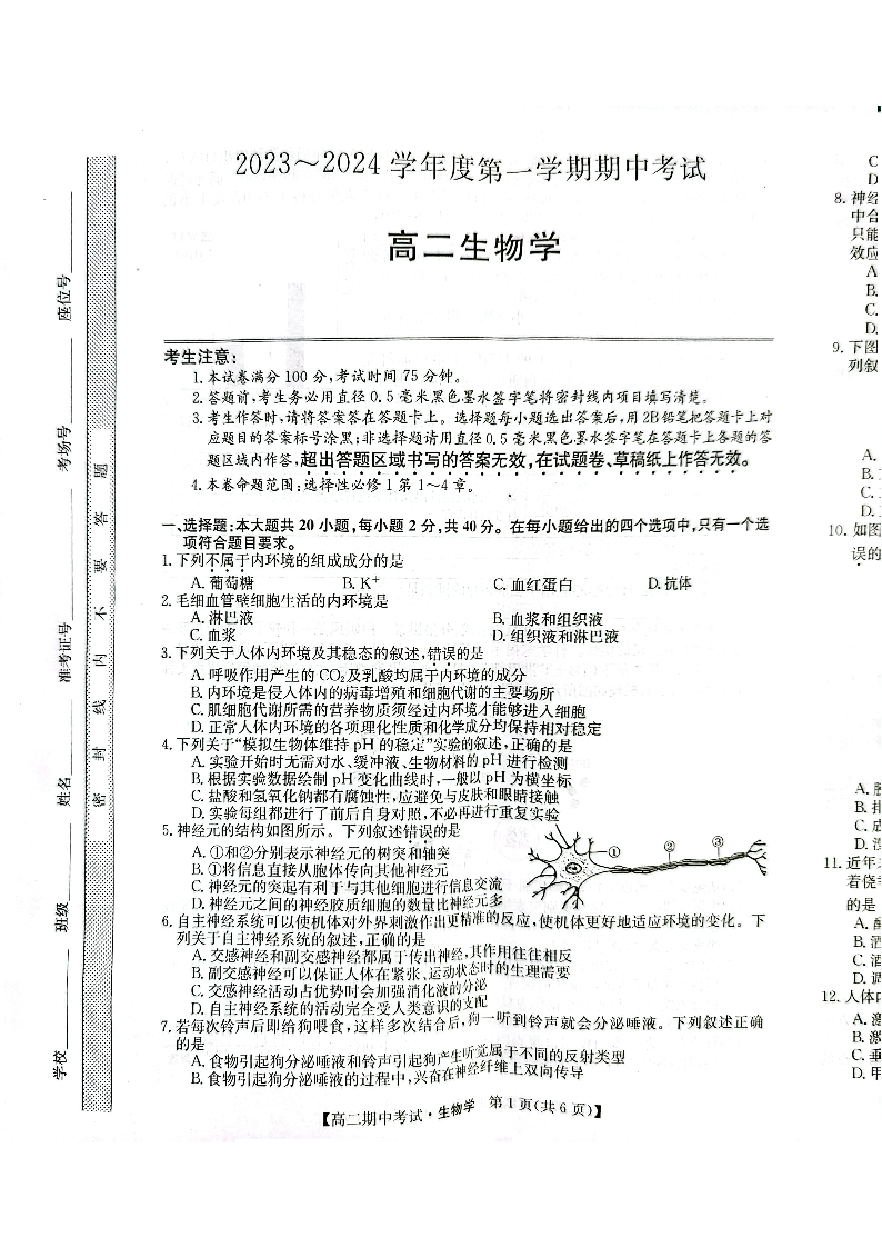 甘肃省酒泉市四校2023-2024学年高二上学期期中联考试题生物
